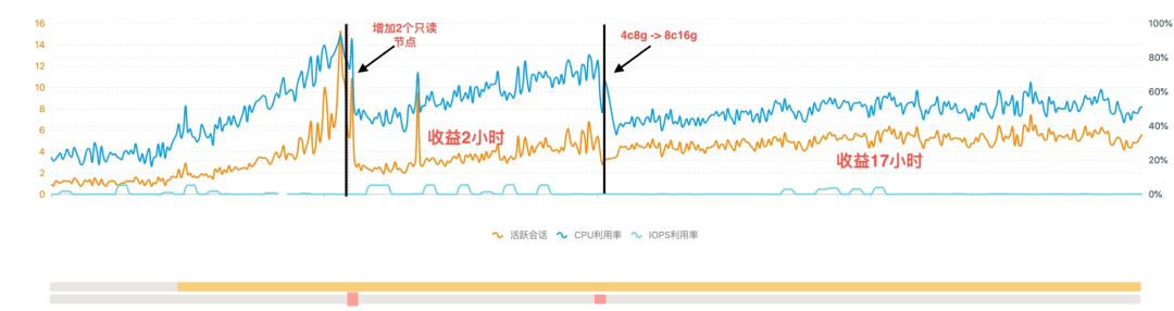 某自治服务接入实例,用户的业务流量不断上升,实例(PolarDB)的CPU使用率不断飙高并达到了高负载状态,此时DAS的Autoscaling算法精确的识别出了实例当前的异常状态,于是自动为实例增加了两个只读节点,实例的CPU使用率成功降到了较低的水位;在维持该状态两个小时后,用户实例的流量依然在不断上升,并第二次触发DAS的Autoscaling,DAS Autoscaling将实例的规格从4核8GB升级到8核16GB,并平稳持续了10多个小时,帮助用户顺利度过了业务高峰期。