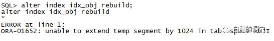 上面是有个rebuild索引时候的报错,无法在一个Perment的表空间里扩展1024个字节的临时段。可能有些粗心的朋友看到这个报错就会说,临时表空间怎么又满了,不是刚扩充过吗?实际上仔细一点的朋友会去看tablespace后面的那个表空间名,通过dba_tablespace去确认这个表空间是临时表空间还是永久表空间。实际上我们有很多操作都会在perment表空间中创建临时段,比如copy table/create table as select alter index rebuild move操作等。