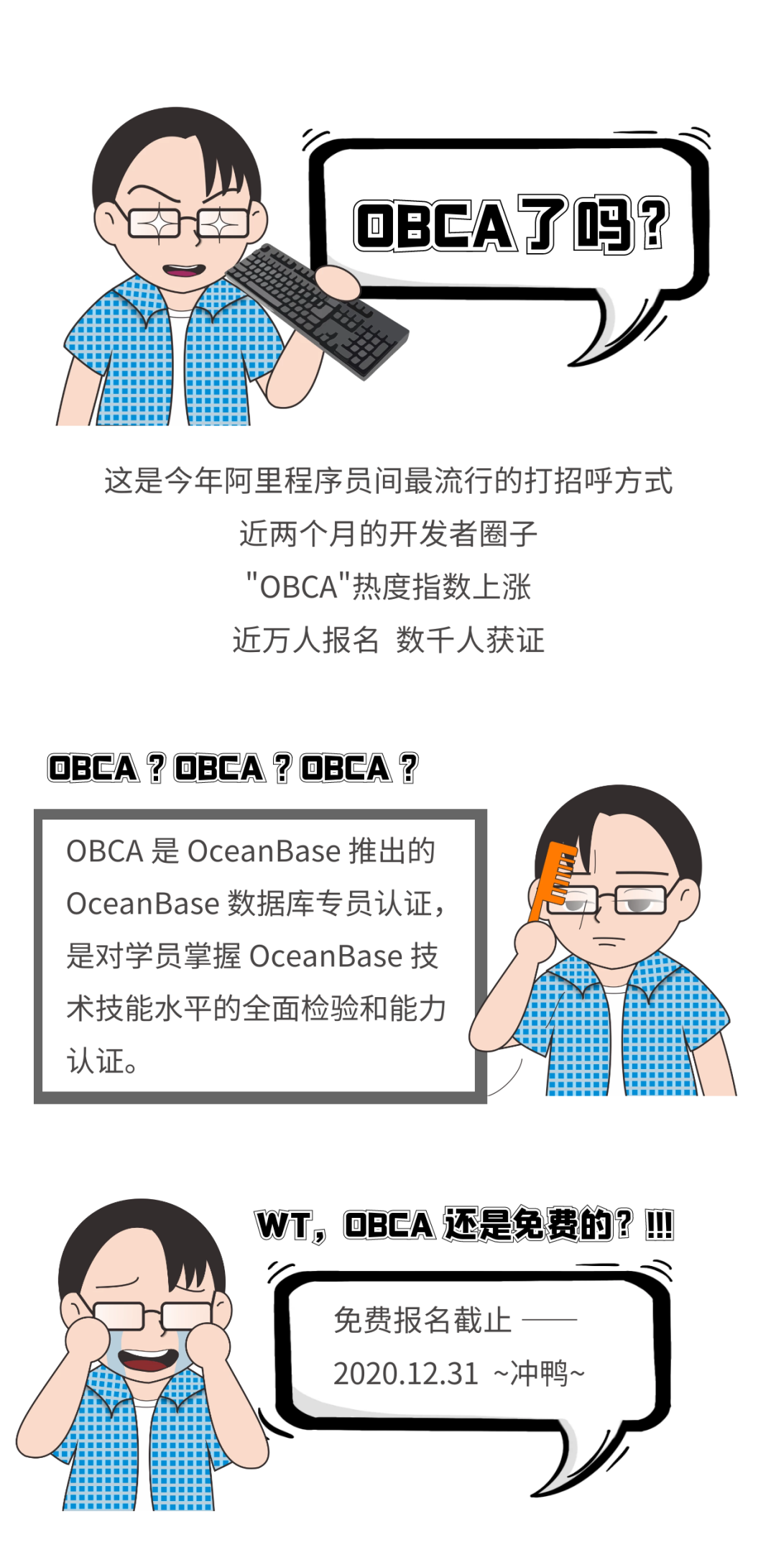 随着2020接近尾声,OBCA 认证免费报名通道即将关闭,截止日期为12月31日,所有学员都可以登陆OceanBase官网(点击阅读原文或浏览器输入 www.oceanbase.com/training)免费报名参与 OBCA 考试。快来报名参与吧!