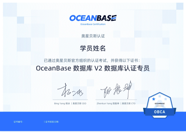 OBCA 认证是 OceanBase 体系化认证培训的第一阶段。线上学习+线上培训+考试,让学员可以合理利用碎片化时间,快速了解 OceanBase 数据库的基础技术架构,掌握基础运维 OceanBase 的能力。OBCA 认证线上前期主要通过学习 OceanBase 的发展历程、应用案例、产品架构、核心功能、部署安装等知识,来理解多副本一致性协议、数据可靠及高可用、在线水平扩展、分布式事务等 OceanBase 的重要特性,后续通过体系化的考试系统来测试学员对运维和管理 OceanBase 的掌握程度。近期,OceanBase 已经开放了OBCP(OceanBase 数据库认证专家)的学习材料,12月底即将开放报名。后续,我们还将上线 OBCE(OceanBase 数据库认证大师)认证,希望通过完整系统化的知识体系,帮助更多数据库行业人才一步步成长为 OceanBase 数据库专家,高效融入 OceanBase 技术生态体系。