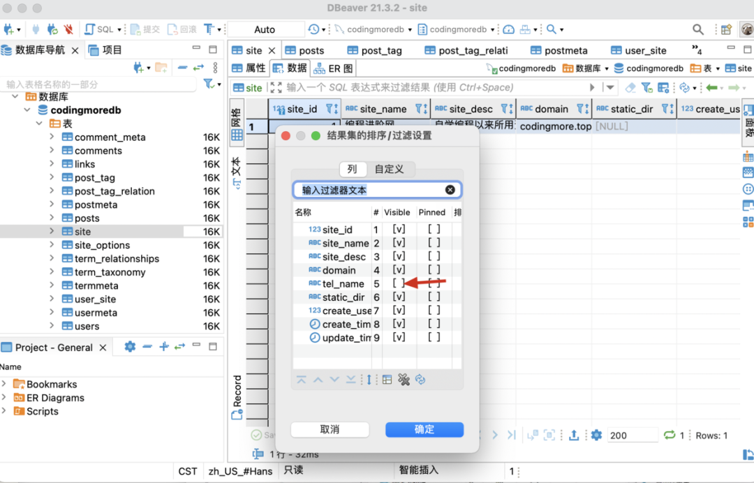 如果不想显示某一列的话,可以直接点击「自定义结果集」图表,将某个字段的状态设置为不可见即可.