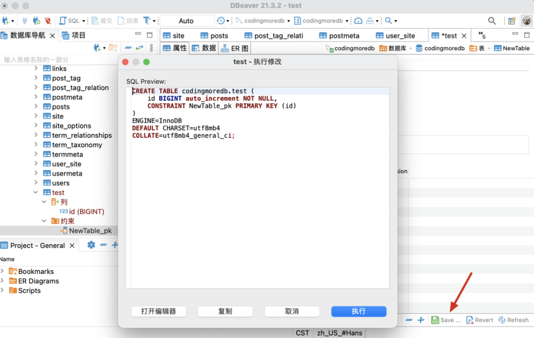 最后点击保存,会弹出一个建表语句的预览框,点击「执行」即可完成表的创建.