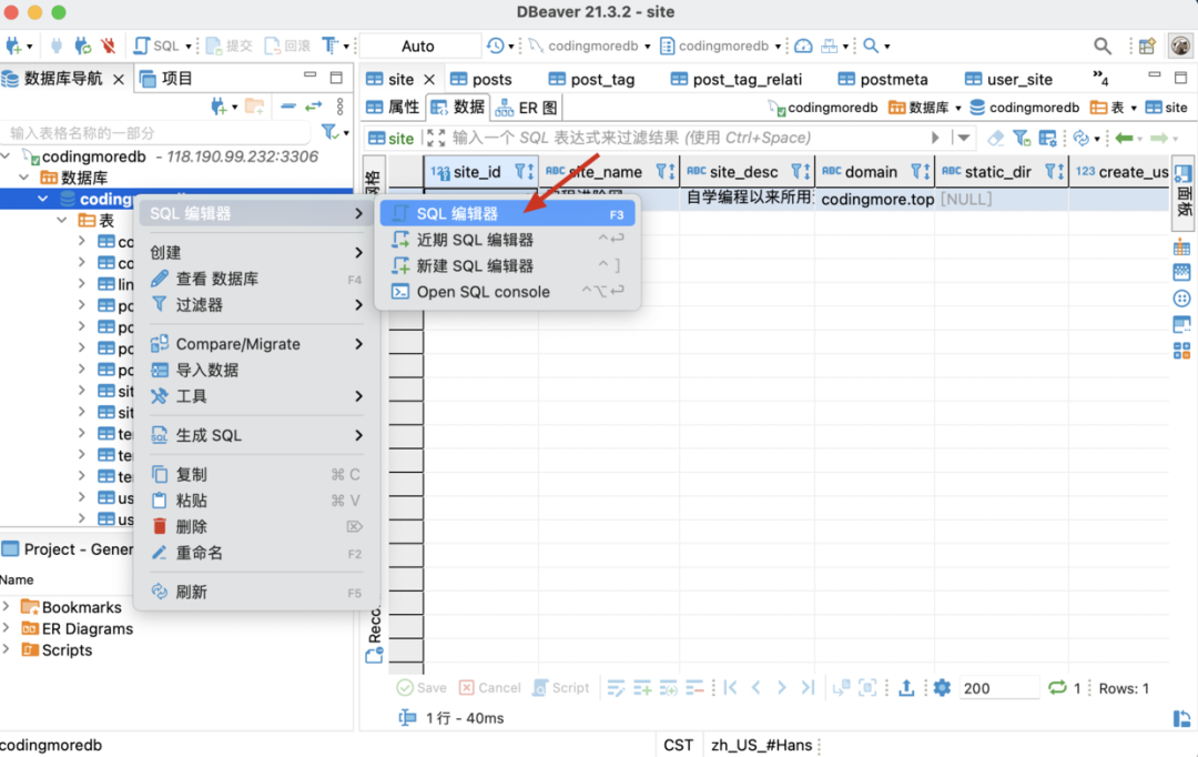 右键数据库表,选择右键菜单中的「SQL 编辑器」可以打开 SQL 编辑面板.