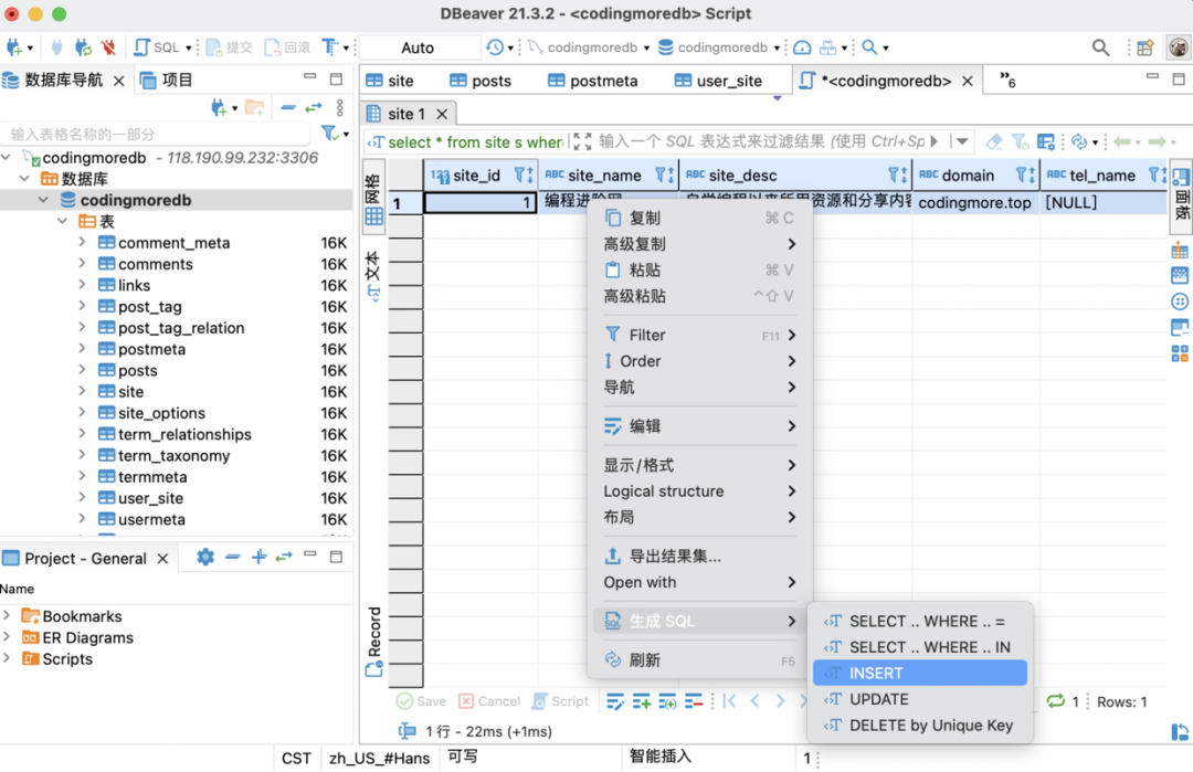 DBeaver 有一个很亮眼的操作就是,可以直接选中一条结果集,然后右键生成一条 SQL.