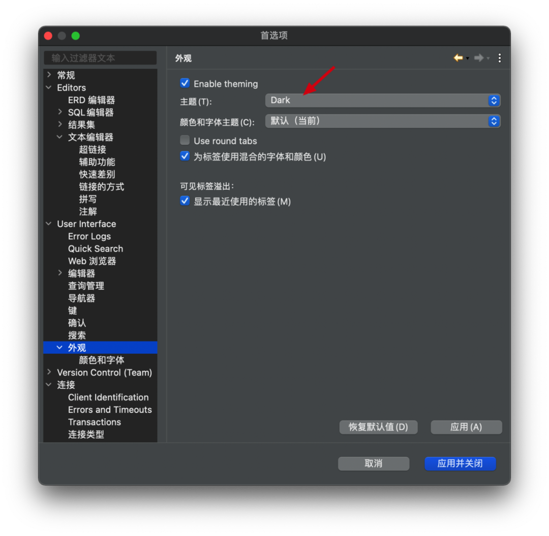 可以在首选项里对外观进行设置,比如设置主题为暗黑色.