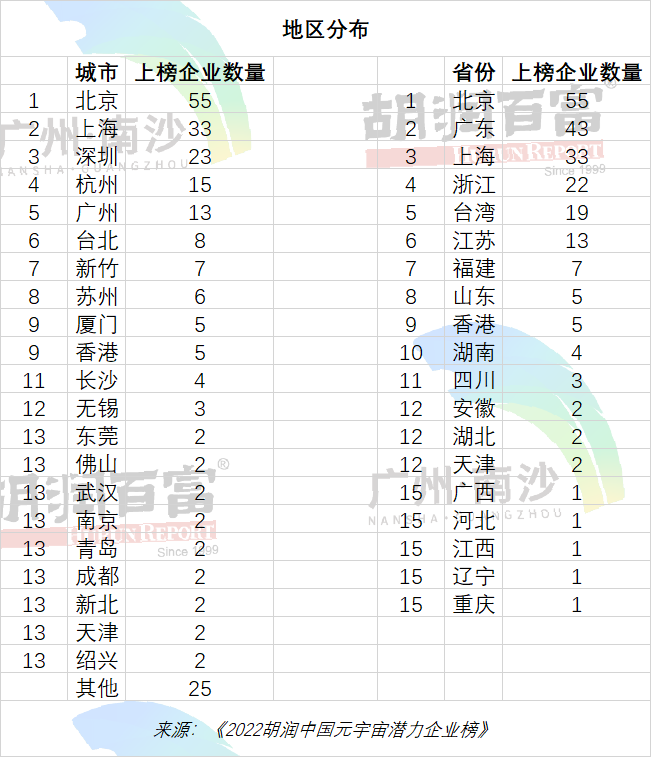 总部位于北京、上海、深圳的企业占一半。北京的企业最多,有55家;其次是上海,33家;深圳第三,23家;杭州第四,15家;广州第五,13家,其中南沙有3家。粤港澳大湾区占全国22%,长三角地区占全国31%。