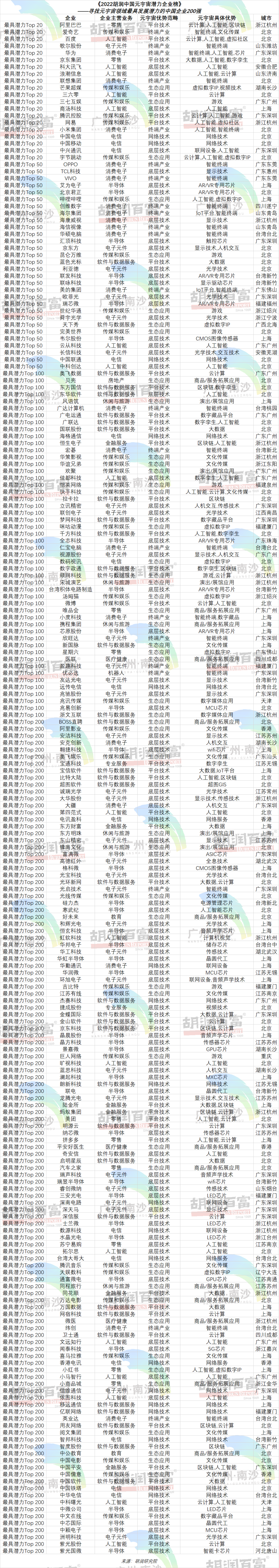 其中,中国移动、中国电信、腾讯控股、阿里巴巴、百度、网易、华为、歌尔股份、小米集团、中兴通讯、京东集团、字节跳动、科大讯飞、商汤科技、浪潮信息、联想集团、芒果超媒、三七互娱、三六零和爱奇艺进入“最具潜力20强”。