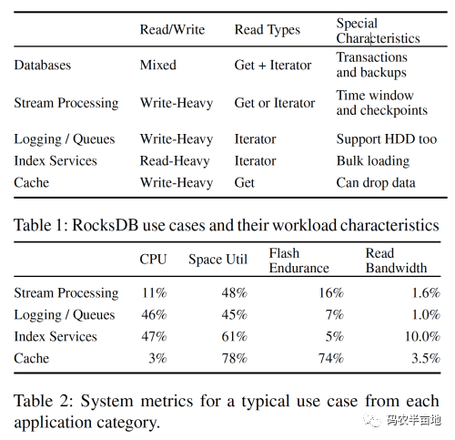 RocksDB 是高度可定制的,因此它作为一个核心 KV 存储引擎能适应各种工作负载,用户可以根据自己的需要对它进行针对性调优,如为读性能优化,为写性能优化,为空间使用率优化,或它们之间的某个平衡点。正是因为如此灵活的可配置性,RocksDB 可以作为很多不同数据库的存储引擎使用,如 MySQL,CockroachDB,MongoDB,TiDB 等,也可以满足流式计算(Stream processing),日志服务(Logging/queuing services),索引服务(Index services),缓存服务(Caching on SSD)等多种特性完全不同的业务需求。这些不同业务场景特性总结如下: