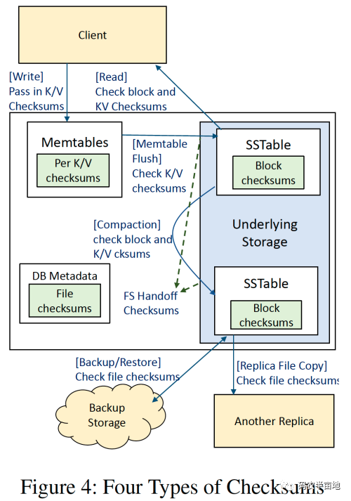 Block checksum。源于 LevelDB,SSTable 中 Block 级别的校验,会在每次读取时进行检查,用于防止由于底层文件系统导致的数据损坏; File checksum。在 2020 年加入,整个 SSTable 的校验,保存在 SSTable 的 meta 字段中,用于防止在传输整个 SSTable 过程中发生的数据损坏; Handoff checksum。用于保护 WAL 文件的机制,核心思想是在写入时将数据及其对应的校验码一起发给底层文件系统,底层文件系统对每次的增量写入进行校验,以此避免写入 WAL 这一过程中发生的错误。然而不幸的是,绝大部分本地文件系统是不支持此类 API 接口的。不过对于远端文件系统来说,可以通过修改 API 接口来支持此类端到端的保护功能。 K/V checksum。计划中的功能,需要修改 RocksDB 的 API 接口并要上层应用配合实现,为每个 kv 都加入校验,这是最彻底的端到端的数据保护措施。