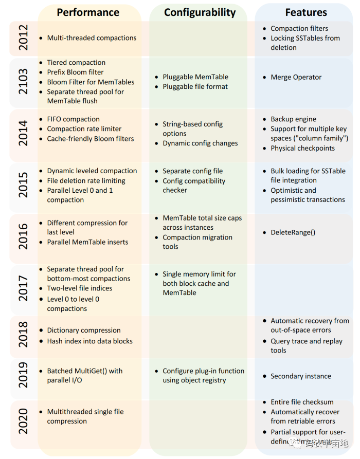 ❝很不错的图~可以看到 RocksDB 性能上的优化主要聚焦于 Compaction 及 Bloom Filter 展开~