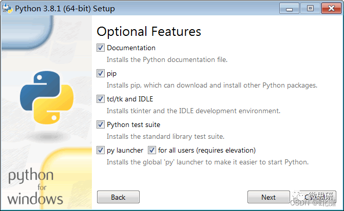 接下来选择自定义安装(默认安装的话会Python安装在系统盘中,我不太习惯将这些装在C盘),选择要安装的组件,一般默认即可,如下图所示: