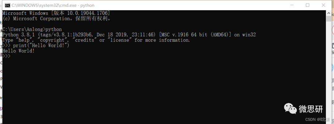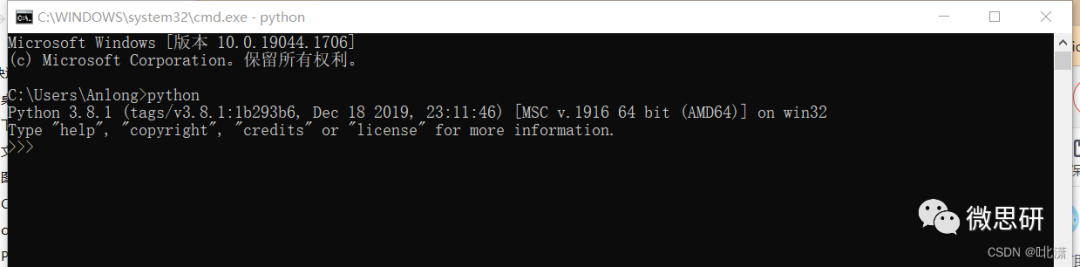 输入python,出现上图所示的交互式环境即表示Python安装成功!在>>>