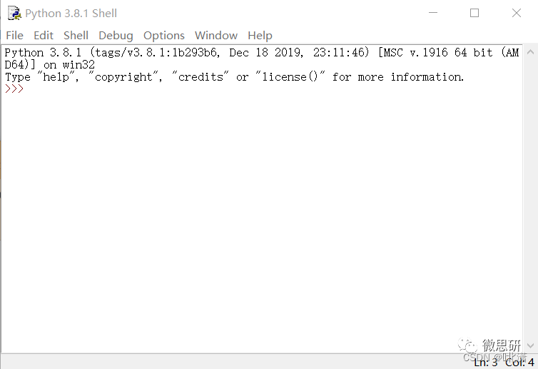 打开后是一个Python的交互式(即有“>>>”符号)编程环境,如下如所示
