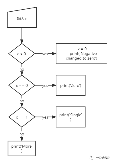 如果x小于0,就让给x赋值0,并且使用print输出消息Negative changed to zero;否则,如果x等于0,就输出消息Zero;否则,如果x等于1,输出消息Single;否则,以上都不符合,输出消息More。)