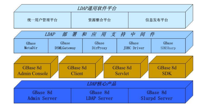 GBase 8d 目录服务产品从核心的目录服务器管理软件,已经发展成为目录服务核心产品、目录服务中间件产品、目录服务应用产品系列。下图是南大通用目录服务产品线的构架: