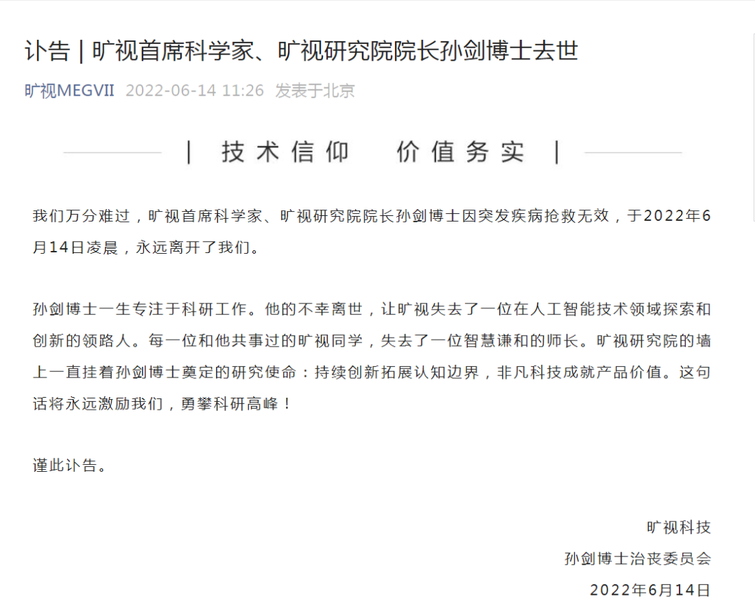 讣告:我们万分难过,旷视首席科学家、旷视研究院院长孙剑博士因突发疾病抢救无效,于2022年6月14日凌晨,永远离开了我们。