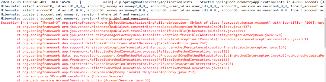 Hibernate: select account0_.id as id1_0_0_, account0_.money as money2_0_0_, account0_.user_id as user_id3_0_0_, account0_.version as version4_0_0_ from t_account account0_ where account0_.id=?Hibernate: select account0_.id as id1_0_0_, account0_.money as money2_0_0_, account0_.user_id as user_id3_0_0_, account0_.version as version4_0_0_ from t_account account0_ where account0_.id=?Hibernate: select account0_.id as id1_0_0_, account0_.money as money2_0_0_, account0_.user_id as user_id3_0_0_, account0_.version as version4_0_0_ from t_account account0_ where account0_.id=?Hibernate: update t_account set money=?, version=? where id=? and version=?Hibernate: select account0_.id as id1_0_0_, account0_.money as money2_0_0_, account0_.user_id as user_id3_0_0_, account0_.version as version4_0_0_ from t_account account0_ where account0_.id=?org.springframework.orm.ObjectOptimisticLockingFailureException: Object of class [com.pack.domain.Account] with identifier [100]: optimistic locking failed; nested exception is org.hibernate.StaleObjectStateException: Row was updated or deleted by another transaction (or unsaved-value mapping was incorrect) : [com.pack.domain.Account#100] at org.springframework.orm.jpa.vendor.HibernateJpaDialect.convertHibernateAccessException(HibernateJpaDialect.java:337) at org.springframework.orm.jpa.vendor.HibernateJpaDialect.translateExceptionIfPossible(HibernateJpaDialect.java:255) at org.springframework.orm.jpa.AbstractEntityManagerFactoryBean.translateExceptionIfPossible(AbstractEntityManagerFactoryBean.java:528) at org.springframework.aop.framework.JdkDynamicAopProxy.invoke(JdkDynamicAopProxy.java:212) at com.sun.proxy.$Proxy95.saveAndFlush(Unknown Source) at com.pack.service.AccountService.deduction(AccountService.java:34) at org.springframework.aop.aspectj.MethodInvocationProceedingJoinPoint.proceed(MethodInvocationProceedingJoinPoint.java:88) at com.pack.aop.retry.RetryAspect.arround(RetryAspect.java:41) at java.lang.Thread.run(Thread.java:745)Caused by: org.hibernate.StaleObjectStateException: Row was updated or deleted by another transaction (or unsaved-value mapping was incorrect) : [com.pack.domain.Account#100] at org.hibernate.event.internal.DefaultMergeEventListener.entityIsDetached(DefaultMergeEventListener.java:341) at org.hibernate.event.internal.DefaultMergeEventListener.onMerge(DefaultMergeEventListener.java:172) at org.hibernate.event.internal.DefaultMergeEventListener.onMerge(DefaultMergeEventListener.java:70) at org.hibernate.event.service.internal.EventListenerGroupImpl.fireEventOnEachListener(EventListenerGroupImpl.java:102) at org.springframework.transaction.interceptor.TransactionInterceptor.invoke(TransactionInterceptor.java:118) at org.springframework.aop.framework.ReflectiveMethodInvocation.proceed(ReflectiveMethodInvocation.java:186) at org.springframework.dao.support.PersistenceExceptionTranslationInterceptor.invoke(PersistenceExceptionTranslationInterceptor.java:139) ... 31 more2020-12-08 15:43:47.975 INFO 12412 --- [ Thread-3] com.pack.aop.retry.RetryAspect : retrying....times:1Hibernate: select account0_.id as id1_0_0_, account0_.money as money2_0_0_, account0_.user_id as user_id3_0_0_, account0_.version as version4_0_0_ from t_account account0_ where account0_.id=?Hibernate: select account0_.id as id1_0_0_, account0_.money as money2_0_0_, account0_.user_id as user_id3_0_0_, account0_.version as version4_0_0_ from t_account account0_ where account0_.id=?Hibernate: update t_account set money=?, version=? where id=? and version=?2020-12-08 15:43:51.022 INFO 12412 --- [extShutdownHook] j.LocalContainerEntityManagerFactoryBean : Closing JPA EntityManagerFactory for persistence unit 'default'2020-12-08 15:43:51.030 INFO 12412 --- [extShutdownHook] o.s.s.concurrent.ThreadPoolTaskExecutor : Shutting down ExecutorService 'applicationTaskExecutor'2020-12-08 15:43:51.031 INFO 12412 --- [extShutdownHook] com.zaxxer.hikari.HikariDataSource : MasterDatabookHikariCP - Shutdown initiated...2020-12-08 15:43:51.053 INFO 12412 --- [extShutdownHook] com.zaxxer.hikari.HikariDataSource : MasterDatabookHikariCP - Shutdown completed.