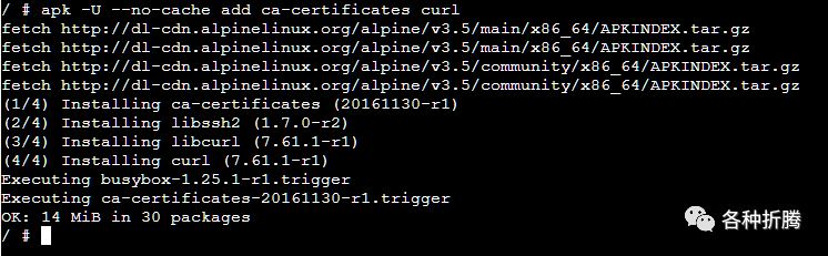中增加一行命令RUN apk -U --no-cache add ca-certificates curl进入容器的终端机,执行