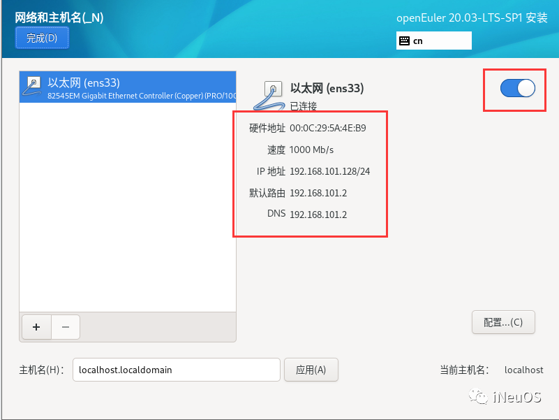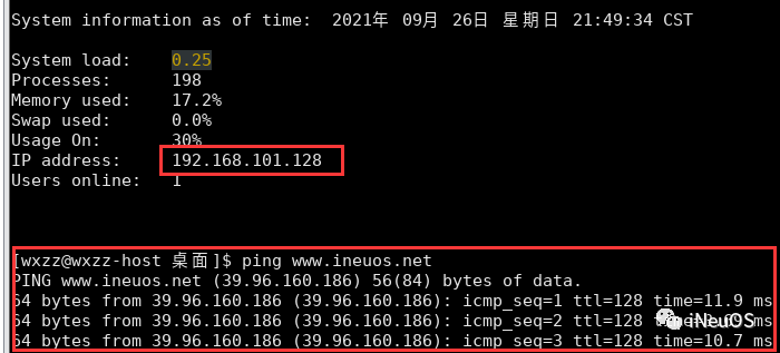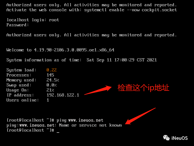 登陆系统后,设置OpenEuler的网络信息。命令:ping www.ineuos.net,看看目前的IP地址能不能上网。