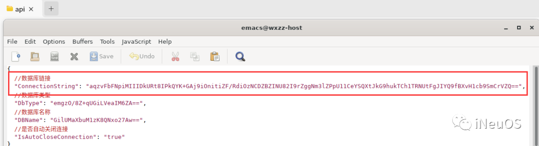 (2)修改后台接口服务(API)访问数据库的配置文件DSConfig.json,考虑到安全性的问题,进行了加密,如下图: