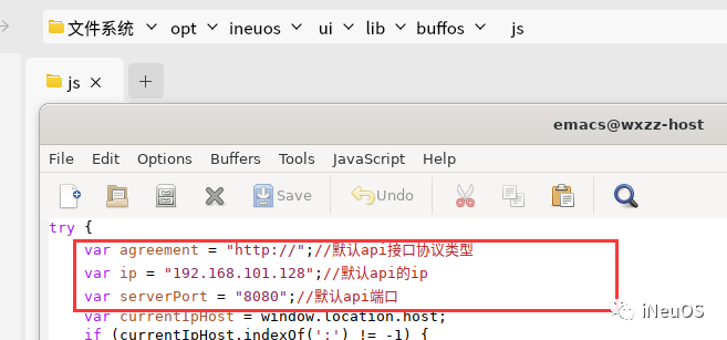 (3)修改前端应用系统(UI)访问后台接口服务(API)的配置文件ui\lib\buffos\js\目录下uiconfig.js,如下图: