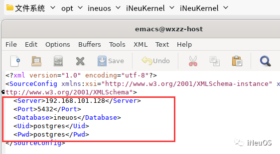 配置/opt/ineuos/iNeuKernel/iNeuKernel/SourceConfig.cfg访问数据库的信息: