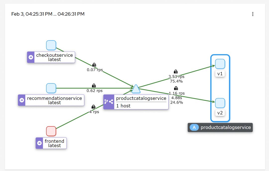 由于 V2 是一个故障升级,如果需要回滚,将 100% 的流量流向 V1 ,只需要更改 productcatalogservice