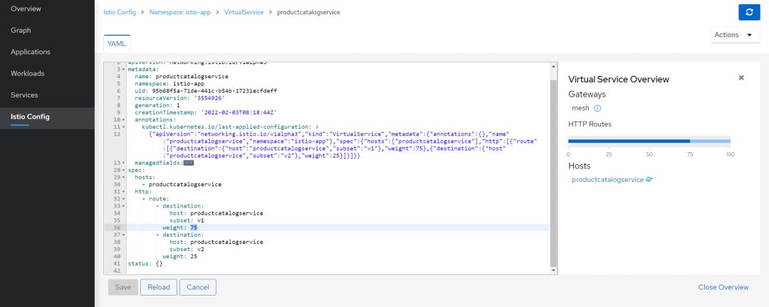 通过配置 Istio 使 75% 的流量流向 V1 , 25% 的流量流向 V2 :
