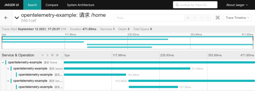 访问后观察 Jaeger UI 可以发现调用链和之前的也一致,包含 5 个 Span