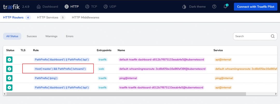 - match: Host(`master`) && PathPrefix(`/whoami/`) # 路由匹配器,匹配 http://master/whoami/