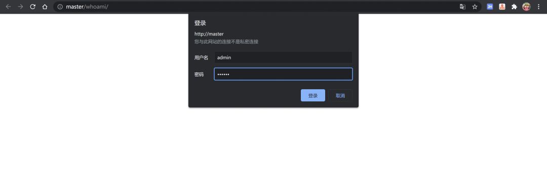 再次访问 http://master/whoami/ 需要键入用户名密码(admin/123456):