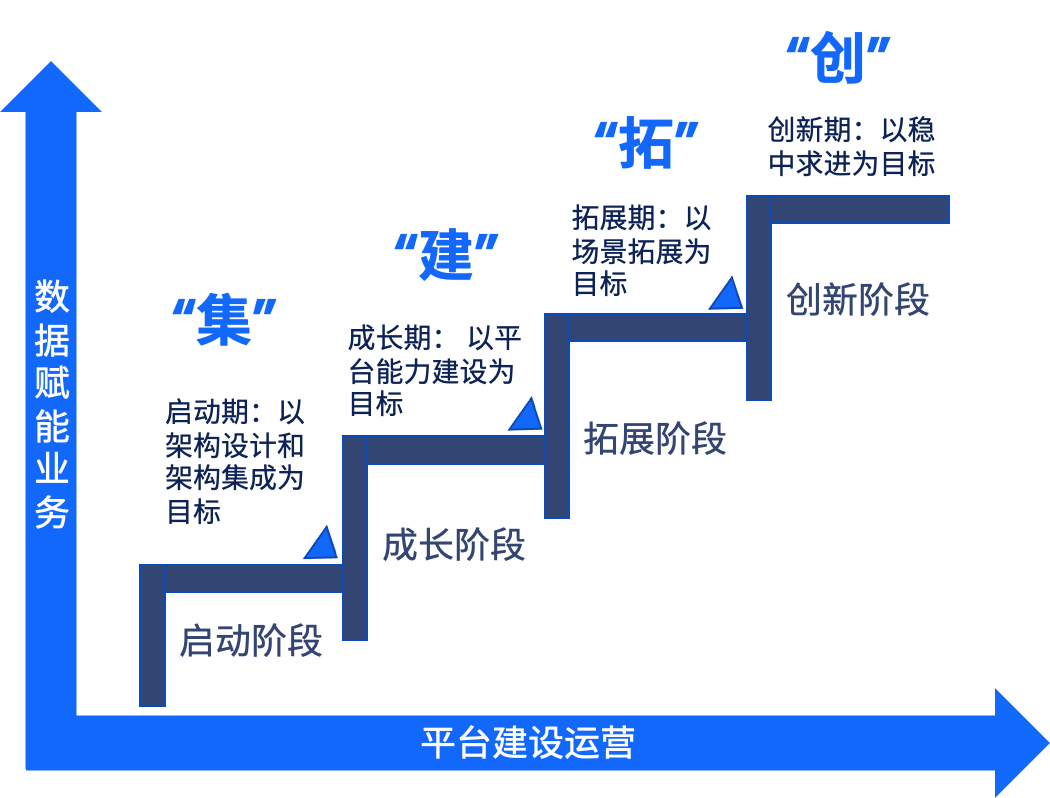 为了更好地实现数据赋能业务,该银行打造了以多维分析平台为技术底座的数据中台层,为业务分析人员提供低门槛的数据分析环境。其构建分析环境的底座大概经历了启动、成长、拓展、创新四个阶段,逐步形成了其目前数字化运营的方法论和体系: