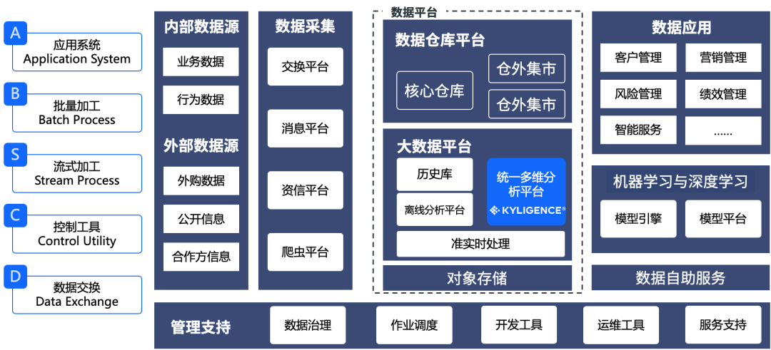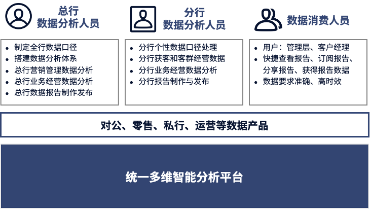 通过系统融合带动业务融合,打破现有以部门为中心的业务系统竖井,构建统一多维数据分析平台,从底层打通总分行的数据和系统,提供可快速复制和共享服务的资源,服务总分行的数字化运营目标;