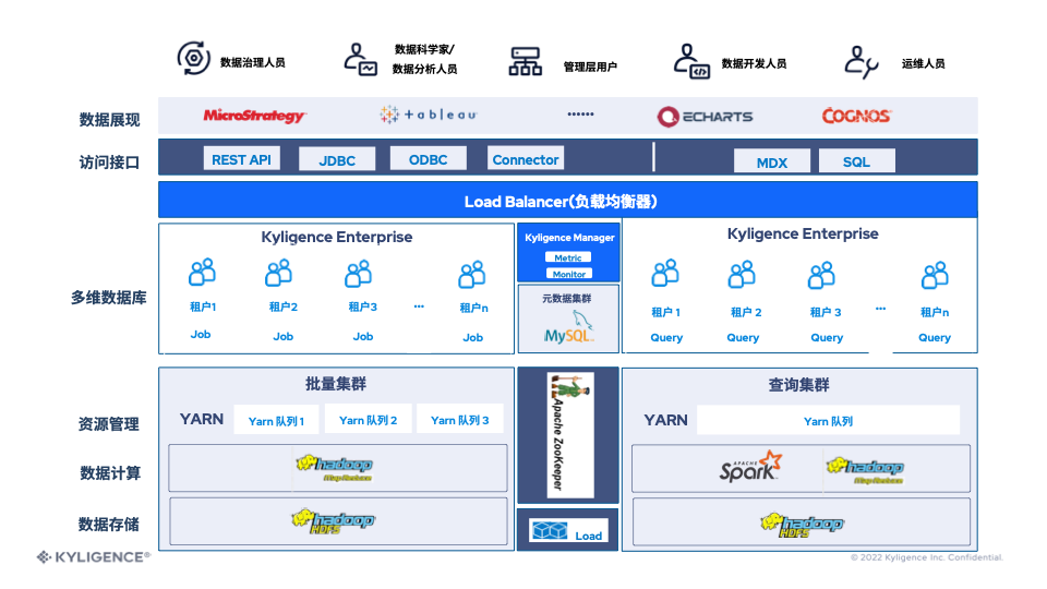 拓展阶段:这个阶段以场景拓展为目标,不断探索适宜的业务场景,并开展相应的推广和培训活动。经过第二阶段的小范围试点取得的经验和成果,引入/吸引了更多的部门加入,同时将数据开放给总行、分行、团队、客户经理等。Kyligence 承载行内对私和对公两大业务,已为全行 20 多个部室、80+ 租户提供数据分析服务。