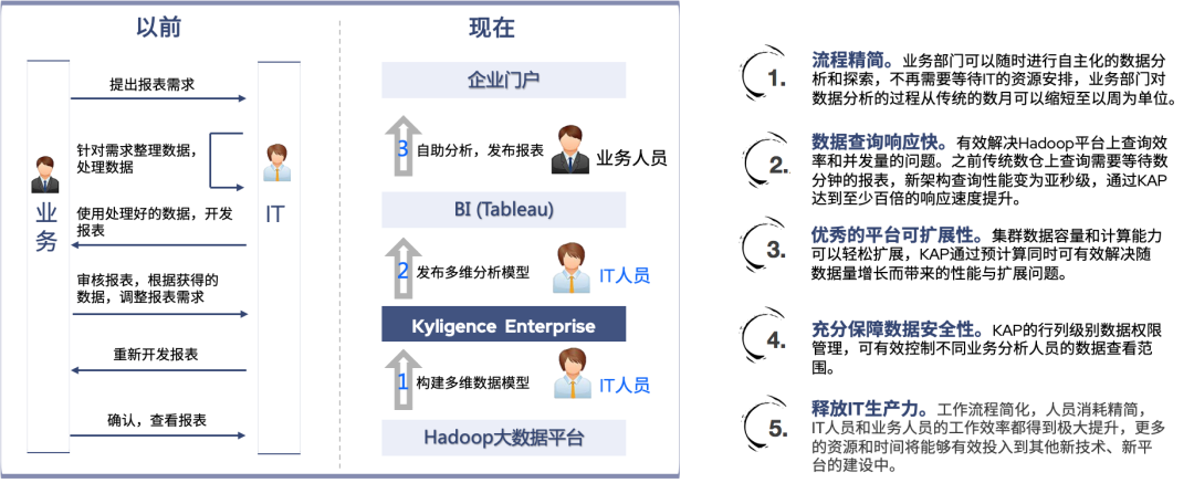 数据时效性差,跟不上市场环境的变化:从数据加工到一线业务人员的手上,整个过程曲折且流程过长,为了保障数据的安全性还需重重审批,数据开发周期长,难以满足业务人员自助式分析需求,而且存在开发运维、管理成本过高等问题。