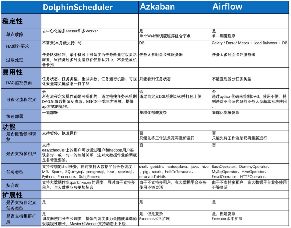 因此,在2019年Apache DolphinScheduler开源时,我们就及时地关注到,并开始了解是否可以进行迁移。当时一同调研了三款软件,Apache Dolphin Scheduler、Azkaban和Airflow。我们基于五大需求。