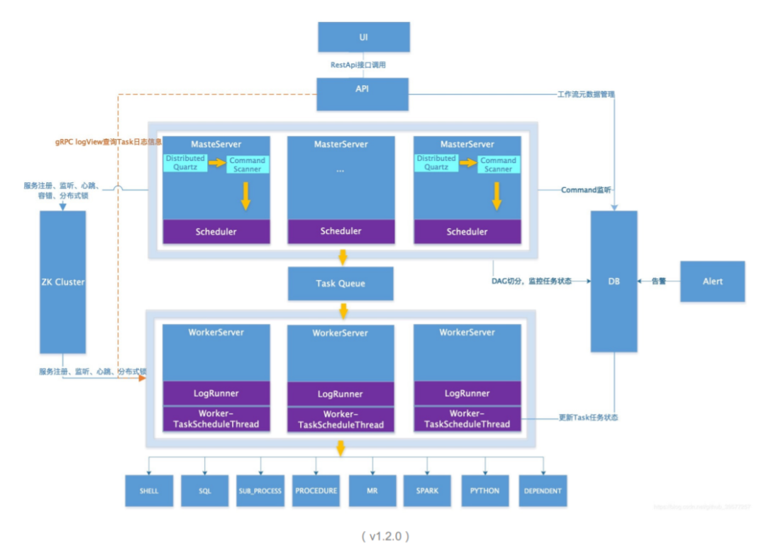 如今我们的数据架构如上图。Apache Dolphin Scheduler承接了整个生命周期从HDFS、S3采集到K8S计算再到基于Spark、Flink的开发。两边的olphinScheduler和Zookeeper都是作为基础性的架构。我们的调度信息如下:Master x2、Worker x6、API x1(承载接口等),目前日均工作流实例:3.5k,日均任务实例15k+。(下图为1.2.0版本架构图)