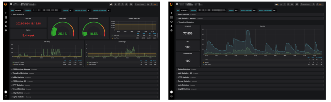 采集Master和Worker执行线程池状态数据,如Master和Worker正在运行的工作流实例、数据库等,用于后续的监控优化和告警(下右图)。