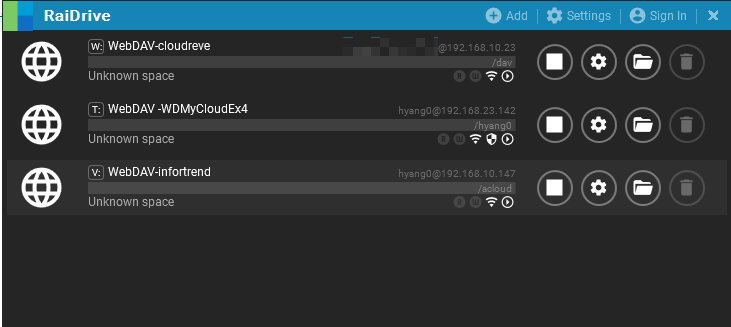 先看一下WebDAV最终使用效果,使用RaiDrive作为WebDAV客户端,连接了三个不同的WebDAV服务: