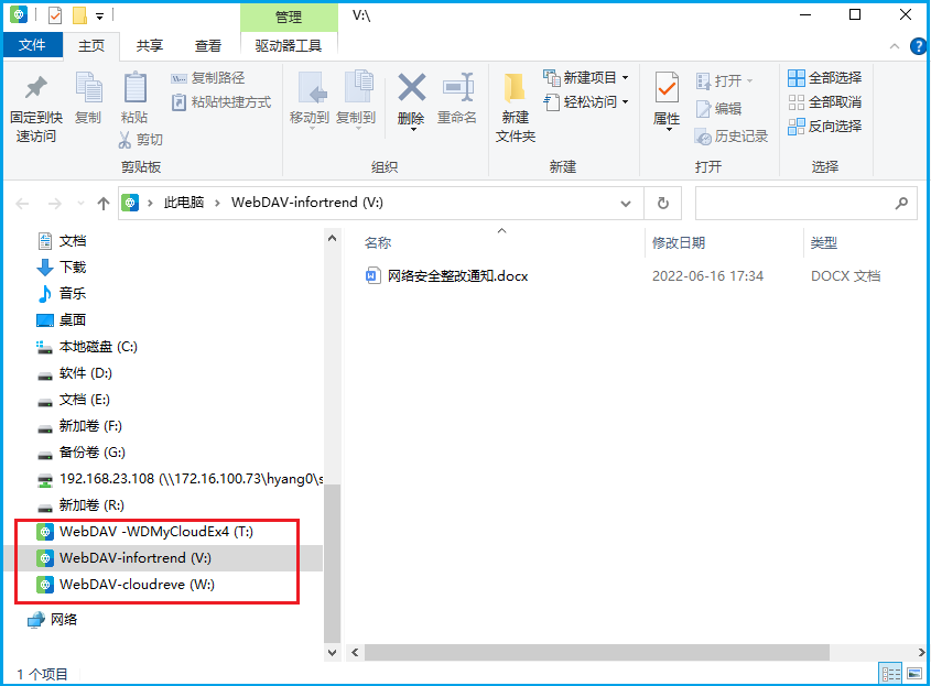 以上就是三种不同 WebDAV 服务的配置,基本流程就是指定 WebDAV 的 URL 以及账号密码,连接成功后会在 Windows 上映射一个驱动器。和使用445端口的SMB 共享目录的使用效果差不多。