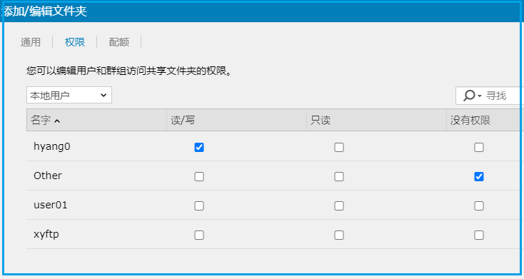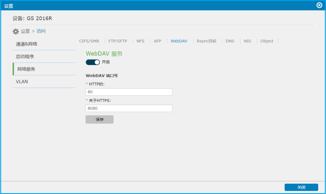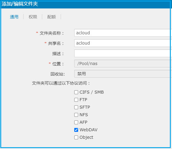 在这款NAS存储上可以看到它支持多种协议,SMB、NFS、WebDAV,当开启相应的服务后,可以使用 http 或 https 来访问共享的资源。在正式访问前,需要在共享目录中设置设置权限。