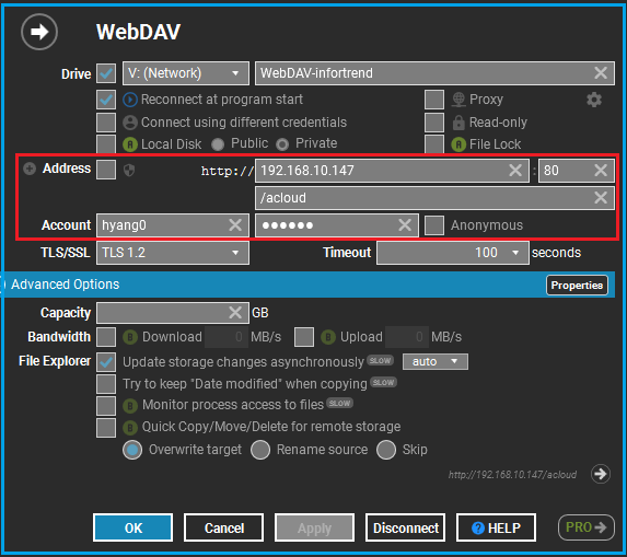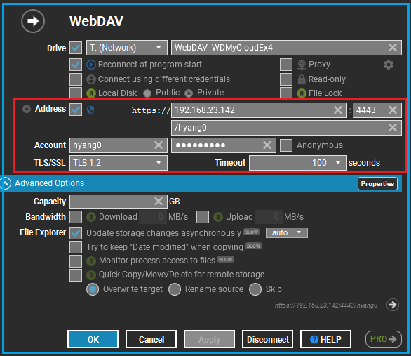 这里需要说明的一点就是各家WebDAV的URL地址是不一样的,My Cloud 的URL地址可以使用以下两个: