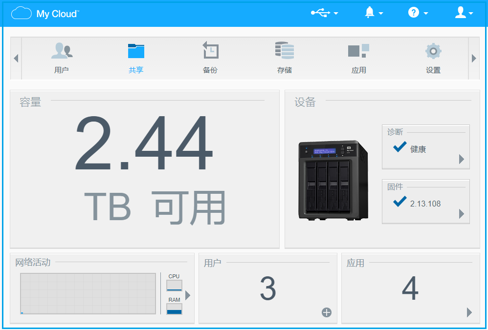 My Cloud 的界面如下,是个4盘位的桌面级NAS。