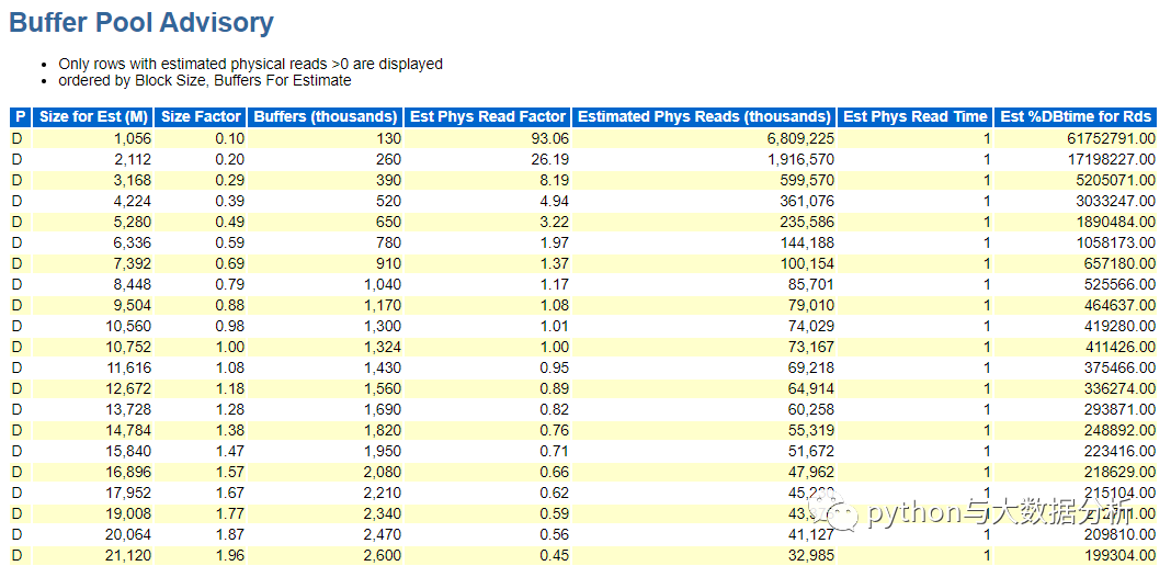这部分,主要从Size Factor、Est Phys Read Factor 都等于1.00的行开始,然后往上看,观察当Size Factor减小时,Est Phys Read Factor是不是明显变化,如果变化不明显,说明可以减小当前的buffer pool设置,相反则表示不能减小;然后往下看,观察当Size Factor增大时,Est Phys Read Factor是不是明显变化,如果变化不明显,说明没必要增大buffer pool设置,相反,则表示增大buffer pool可以提高系统性能。如上面的例子,则可以将buffer pool减小一半。