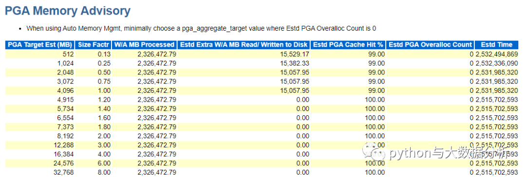 PGA Memory Advisory 可以直观看出pga_aggregate_target 设定在4G左右已经足够,没什么可讲的。