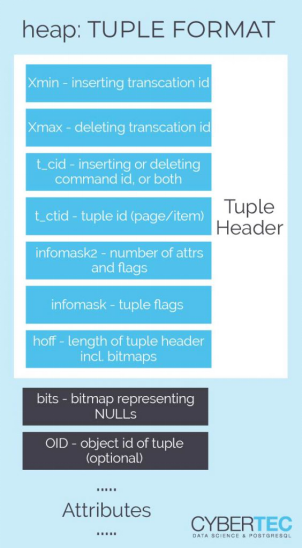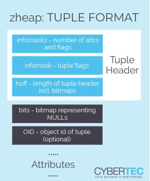 下面是一个标准的PostgreSQL 元组header的内容: | Zheap的元组的header: |