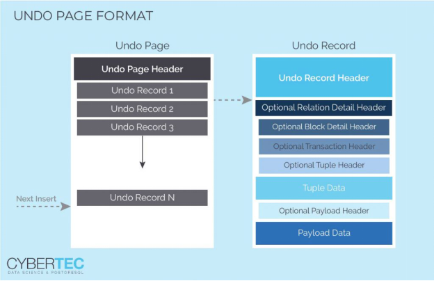 为了确保这个事务执行正确,UPDATE不能只是覆盖旧的值并且丢弃它们。有两个理由:首先,我们需要支持并发,数据在被修改时其他用户要能读取。其次就是更新一条记录并不意味着它一定被commit,因此我们需要一种有效的方式来处理rollback。经典的PostgreSQL存储格式会在标准表中复制一条记录从而导致上面提到过的所有膨胀相关的问题。Zheap处理这事有一点不同:数据更新发生时,系统通过记录“undo“信息来处理事务可能因为任何原因被终止。这是基本的概念也适用于INSERT,UPDATE和DELETE,我们可以逐一看下这些操作中它是如何工作的:INSERT:增加行