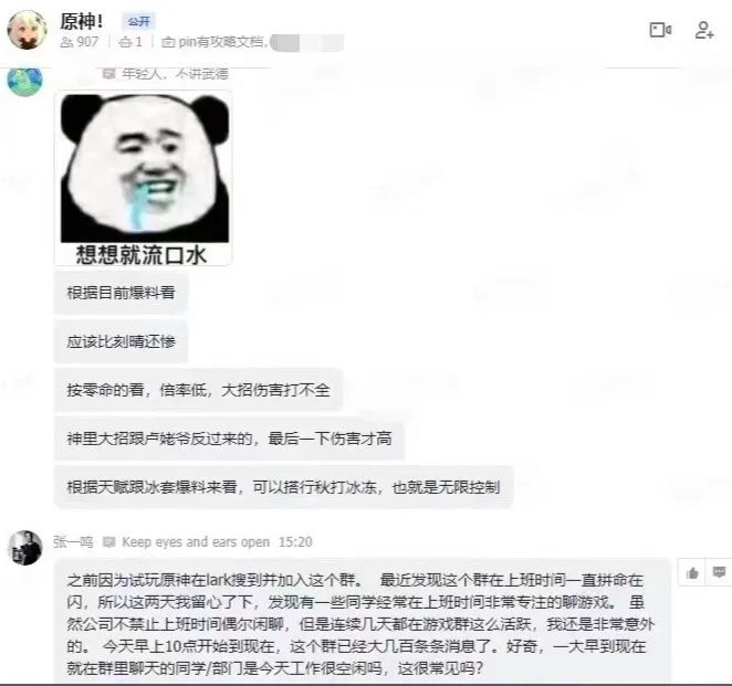 12 月 9 日字节跳动 CEO 张一鸣发现公司《原神》群中出现一些员工在上班时间非常专注的聊游戏,对此表达了不满。张一鸣称,“虽然公司不禁止上班时间偶尔闲聊,但是连续几天都在游戏群这么活跃,我还是非常意外的。”