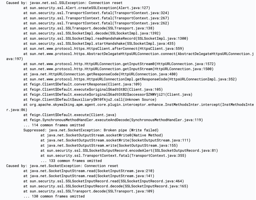 过了几天又出现了几次,排查继续通过看日志发现Caused by: javax.net.ssl.SSLException: Connection reset,而且目标服务没有收到请求,没有日志输出。