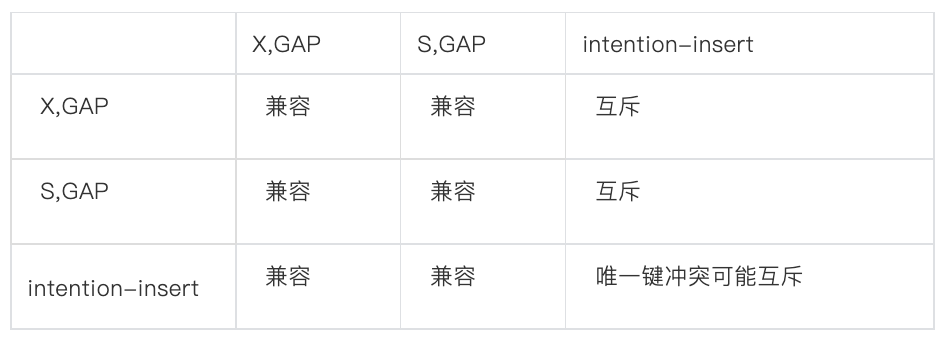 插入意向锁,仅用于insert语句,表明将在某间隙插入记录,与间隙锁互斥关系如下: